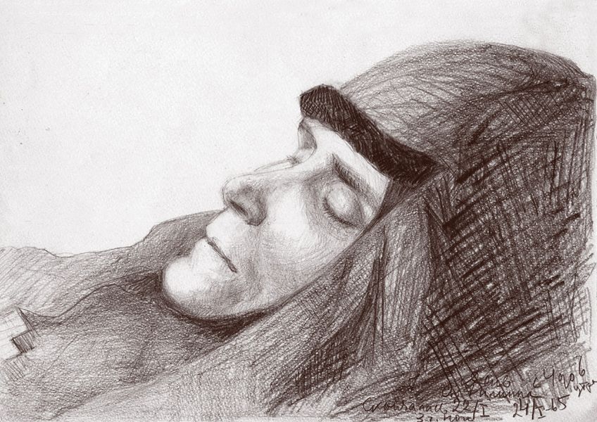 Через некоторое время, приподняв плат, заглянули на ее лицо и были поражены изменившемуся выражению его. На нем отражалась легкая улыбка и глубокий покой. Оно было так прекрасно, что хотелось смотреть на него без конца. В последнюю ночь я сделала карандашный набросок лица матушки. Говорят, он хорошо передает его выражение...
