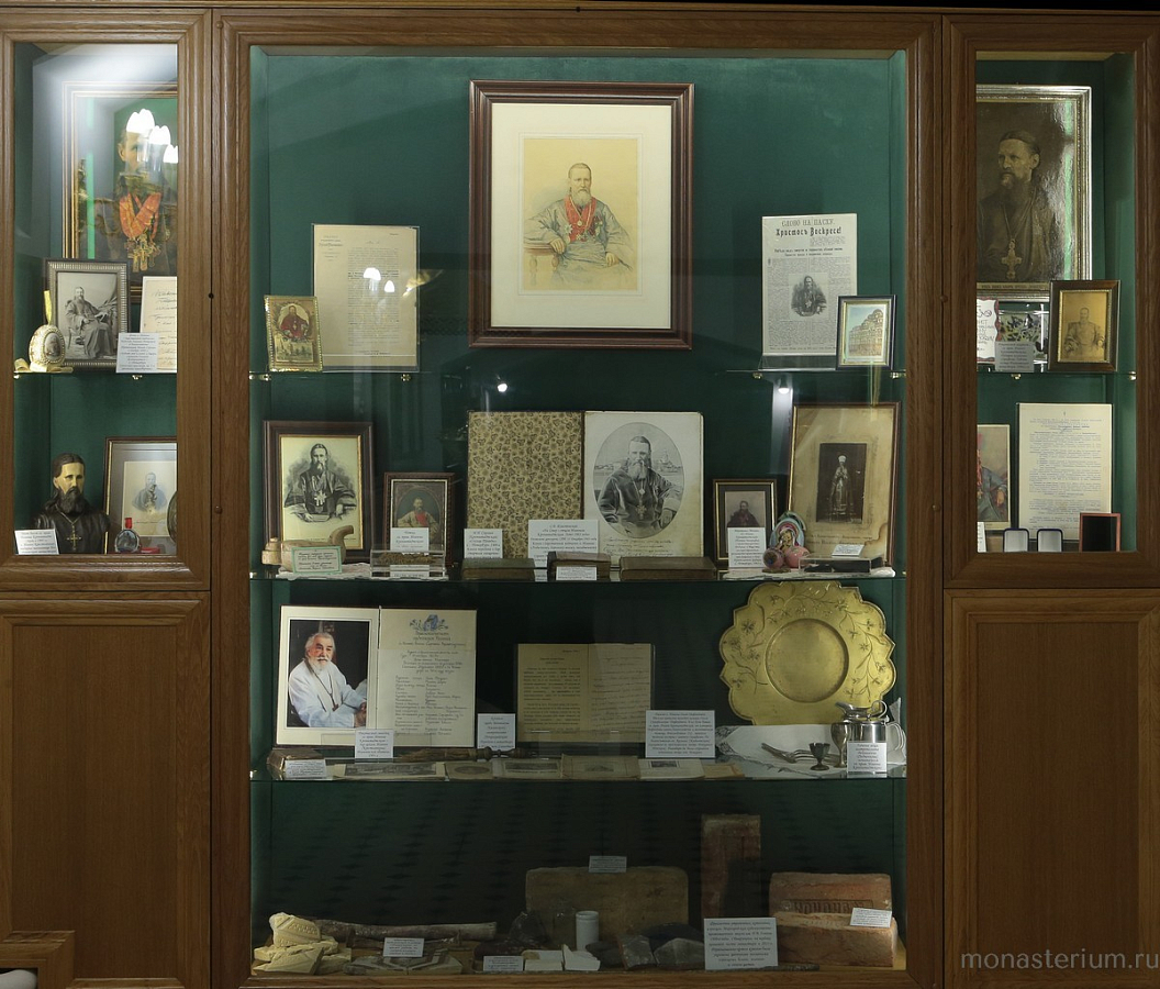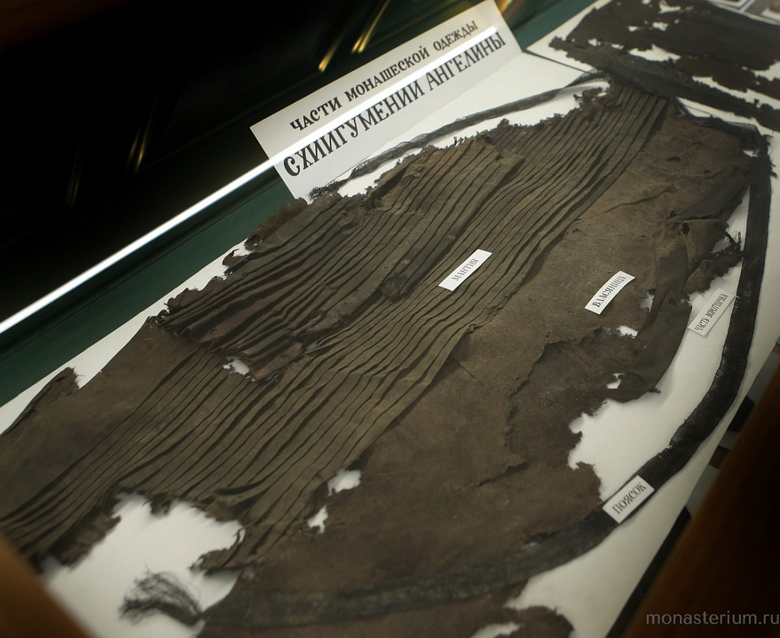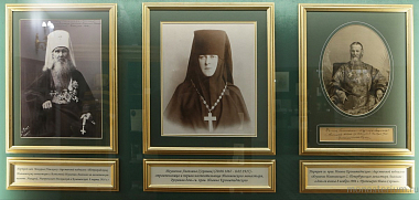 Что касается реликвий, то их приносили в монастырь и раньше. Например, в середине 90-х годов прошлого века, на заре возрождения обители, кто-то (сестры теперь жалеют, что не записали, кто именно) принес портрет святого праведного Иоанна с дарственной надписью: «Игумении Санкт-Петербургского Иоанновского монастыря Ангелине в день Ангела 8 ноября 1904 года. Протоиерей Иоанн Сергиев». А уже в нашем веке, в самом его начале, монастырю был подарен другой портрет, тоже принадлежавший матушке Ангелине, и тоже – с дарственной надписью: «Петроградскому Иоанновскому монастырю. Игумении Ангелине на молитвенную память. Макарий, митрополит Московский и Коломенский». Широко известен случай: святитель Макарий (Невский), крупный миссионер, «апостол Алтая», получил исцеление по молитвам святого праведного Иоанна Кронштадтского, с которым его связывали тесные духовные узы. Владыка, страдавший от болезни кожи около шести лет, детально описал, как сухая экзема, превратившись в мокрую, переходила с одной части тела на другую и особенно беспокоила его ночью: нужно было вставать, снимать бинты, старую мазь стирать, смывать, новую намазывать на больные места и опять бинтовать. 20 декабря (в день кончины отца Иоанна) 1913 года он был приглашен в Иоанновский монастырь служить литургию в усыпальнице, где погребен святочтимый пастырь и молитвенник. После обедни отслужил панихиду у гробницы почившего и попросил исцеления. И, по его признанию, с того же дня началось его освобождение от мучительного недуга. «Тогда мне понятно стало, что со мной совершилось чудо милости Божией по молитвам того, кто еще при жизни прославился как чудотворец», – написал Святитель. Сейчас эти портреты с дарственными надписями можно увидеть в открывшейся экспозиции. Третий портрет на витрине – портрет первой игумении обители.