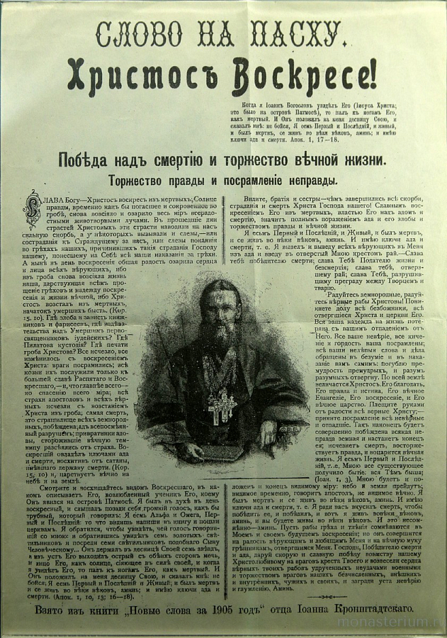 Эти слова, полные веры, были сказаны святым праведным Иоанном Кронштадтским в 1907 году. Есть их продолжение: «На костях мучеников, как на крепком фундаменте, будет воздвигнута Русь новая – по старому образцу, крепкая своей верою во Христа Бога и Святую Троицу – и будет по завету князя Владимира, – как единая Церковь». Многие пророчества великого подвижника и молитвенника вспоминаются, когда подходишь к его гробнице в храме-усыпальнице Иоанновского ставропигиального женского монастыря в Санкт-Петербурге. Здесь же рядом – гробница с честными останками первой настоятельницы обители – схиигумении Ангелины (Сергеевой)– духовной дочери отца Иоанна. А если повернуть направо в этой подземной церкви, то дальше располагается открывшаяся осенью этого года постоянная выставочная экспозиция, посвященная святому праведному Иоанну Кронштадтскому и истории обители. Ее по праву можно назвать монастырским музеем, в котором представлены личные вещи Батюшки; предметы, принадлежавшие первой игумении монастыря и монахиням, изгнанным из обители; дореволюционные издания Иоанновского монастыря и многие другие реликвии.