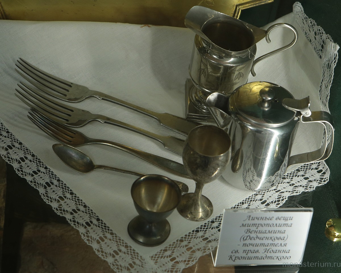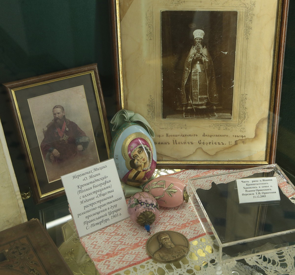 А то кресло отца Иоанна, которое долго хранилось в монастыре, находится теперь во втором зале музея. Если первый зал посвящен Иоанновской обители, то второй – святому праведному Иоанну Кронштадтскому. Во втором зале за стеклянной витриной находятся облачения святого Иоанна Кронштадтского, одно из которых передал в дар Святейший Патриарх Алексий II. Есть здесь и митра Батюшки, и перо, которым он писал, и его письма. Столько разных экспонатов собрано, что о них и тех людях, которым они принадлежали, а также об их родственниках – кровных или духовных, – передавших ценные реликвии Иоанновскому монастырю, можно целую книгу составить!