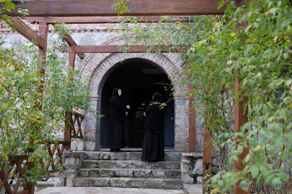В монастыре подвизается 15 сестер, еще две сестры несут послушание в митрополии и три – на подворье. Таким образом монашеская семья насчитывает 20 человек. После обеда те, кто находится в обители, собираются вместе для духовного общения с матушкой-настоятельницей. Даже в Типиконе записано, что никто пусть не позволит себе в это время пропустить беседу с настоятельницей. Одна из основных тем бесед – духовная брань, происходящая с человеком на путях спасения души. Слава Богу, сейчас доступно много источников, дающих духовную пищу для обсуждения вопросов борьбы со страстями, греховными привычками и наклонностями. И в последнее время для монашествующих одним из таких источников стали выступления архипастырей и пастырей, игуменов и игумений (в том числе и гостей-святогорцев) на Международных Рождественских образовательных чтениях в Москве, в которых схиигумения Иоанна тоже принимает участие. Кстати, сестрам, знающим русский язык, она раздает тексты выступлений, звучавших на Чтениях. Тем, кто не знает, излагает их суть на грузинском. Часто пересказывает материалы из журнала «Монастырский вестник». Чувствует, что сестрам это интересно, что для них это важно. Готовясь к беседам с сестрами, матушка Иоанна также выбирает из огромного информационного потока необходимую информацию. Ведь нельзя не учитывать, что насельницы монастыря – это современные люди, вышедшие из мира с большим информационным багажом. И о событиях, происходящих в родной стране, о событиях в России им хочется знать. Обсуждается во время такого теплого, в полной мере можно сказать, семейного общения и вопрос создания небольшого монастырского музея, призванного рассказать не только об истории древней обители, но и об истории российско-грузинских отношений сквозь призму их христианского понимания. Наши страны, объединенные общей верой, пережили разные этапы этих отношений – и хорошие, и грустные, о чем, по убеждению схиигумении Иоанны, надо говорить откровенно, чтобы взгляд на историю был непредвзятым и объективным. И тогда «зомбировать» людей, манипулировать их сознанием будет сложно.