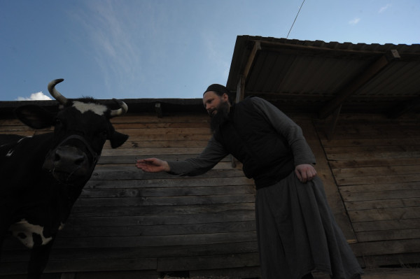 Отец Антоний совершенно лишен рисовки, удивительно прост и прям в общении. Впрочем, так можно сказать о большинстве здешних насельников, но отец Антоний выделяется даже на их фоне. Основное его послушание – работа на монастырской ферме. Бóльшую часть своей жизни он проводит в компании коров, кур и гусей, отлучаясь из хлева только в храм на богослужения, в келью на сон и в трапезную на обед и ужин. Впрочем, последнее не всегда верно: бывает, что и обедает отец Антоний тут же, на рабочем месте. Иногда он здесь даже спит – в небольшой отгороженной каморке с холодильником, столом и старым сервантом, в котором за стеклом хранятся самые разнообразные ветеринарные препараты.