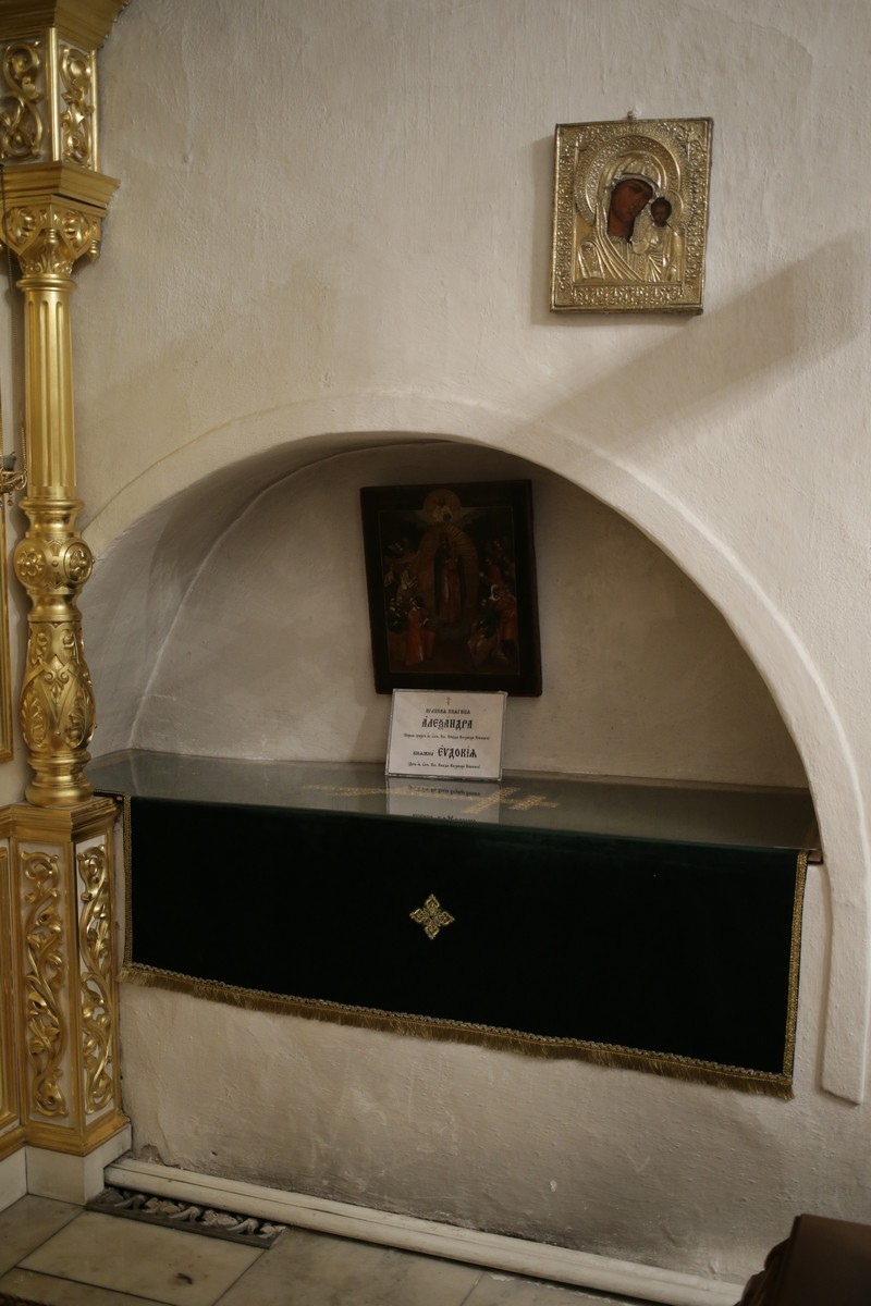 Матушка Олимпиада провела нас в собор. Зайдя в Христорождественский придел (где два с лишним десятилетия назад нашли приют сестры возобновленного монастыря), мы вместе с группой паломников тихонечко, чтобы не мешать монахине, читающей Неусыпаемую псалтирь, прошли к погребению супруги Александра Невского – княгини Александры Брячиславовны и их дочери – княжны Евдокии. Основанный супругой великого князя Всеволода Большое гнездо Марией Шварновной, этот монастырь с самого начала задумывался как родовая усыпальница княгинь и княжон великого Владимирского княжества. В XIII веке здесь были погребены сама устроительница обители – святая благоверная великая княгиня Мария (в иночестве – Мария, в схиме – Марфа), ее сестра Анна и другие особы знатного рода. Какую эпоху в России ни возьми, каждая из них была отмечена расцветом таких личностей, мудрость и благочестие которых придавали силы и укрепляли в вере последующие поколения на протяжении многих веков. Вот, например, жена древнерусского князя с непривычным для нашего слуха отчеством: Шварновна. По наиболее достоверной версии она была дочерью чешского князя Шварна.  Рано оставшись сиротой, девушка росла в родственной семье владимиро-волынского князя и с детства воспитывалась во страхе Божием. Господь соединил в супружестве десятого сына Юрия Долгорукого и боголюбивую сироту. У любящих супругов родилось 12 детей (четверо их сыновей почитаются в лике святых), потому и прозвали князя ­– «Большое гнездо». Вероятно, предчувствуя близкую кончину, Мария Шварновна вместе с супругом решила создать новый женский монастырь во Владимире и удалилась туда с согласия мужа. А через 19 дней она обрела вечный покой, успев принять монашество.