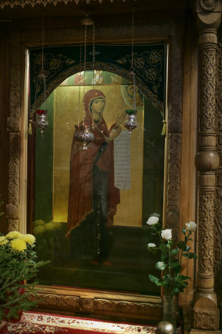 Мы долго стояли с матушкой-настоятельницей возле иконы Божией Матери Боголюбская (которую еще называют «Боголюбивая»), принесенной во Владимир святым благоверным князем Андреем, вторым по старшинству сыном Юрия Долгорукого. Сейчас в иконостасе находится современный образ. Сведения о чудотворном образе, написанном русскими мастерами в XII веке по просьбе князя в память о явлении ему Божией Матери, таковы: в 1992 году по ходатайству владыки Евлогия он был помещен в Успенском соборе Княгинина монастыря, который в то время еще принадлежал музею. Когда же в1993 году монастырь был открыт, верующие получили возможность молиться перед древней иконой. Но в 2009 году, после обнаружения на ней плесени, ее взяли на реставрацию. В настоящий момент чудотворный образ находится в специально оборудованном помещении Владимиро-Суздальского музея. А современный список в иконостасе, сообщила Матушка, мироточит...