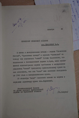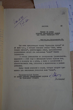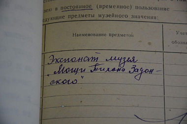 Интерес к мощам проявили работники Орловского краеведческого музея, обратившись к местным светским и церковным властям с просьбой вернуть им этот «экспонат». 23 сентября того же года Н. Зверев, исполняя распоряжение Исполкома Орловского облсовета депутатов трудящихся, передал мощи святителя Тихона директору музея «тов. Кореневой» [14]. О чём и отчитался прокурору Орловской области. В письме же Орловскому епископу Иерониму Зверев напомнил, что разрешения органов советской власти на возвращение мощей из музея в церковь не было.