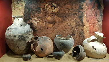 Вслед за рассказчицей я спускаюсь в полутемный зал, где видны деревянные балки и глубокий подпол с древними кувшинами, большими и маленькими.