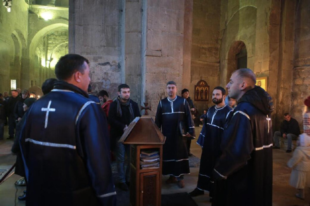 Кто хочет напитаться великой благодатью этого святого места – помолиться, поучаствовать в богослужениях, причаститься, он может остаться на какое-то время в монастырской гостинице. В ней размещают архиереев, приезжее духовенство, церковных работников есть и несколько мест для паломников-богомольцев. По словам архимандрита Серафима, у братии монастыря послушаний, тяжелых в физическом плане, нет. (Служба и дежурство в храме, прием паломников и туристов, послушание в Патриаршей резиденции во Мцхете, послушание в трапезной, на просфорне, на производстве свечей). Но огромного напряжения духовных сил, отдачи всего себя без остатка требует, например, принятие исповеди. Братия в священном сане служит, исповедует. В течение дня исповедовать приходится много людей. Много молодежи, студентов стало приходить в храм за духовным окормлением. Исповедь для молодых людей, да и для людей постарше нередко становится их первым шагом на пути к Богу. За этим, быть может, еще робким шажком нужно сделать второй, третий, более решительные, чтобы человек ступил на путь воцерковления и не сошел «с дистанции». Чтобы нашел в себе силы неустанно бороться с искушениями, особо изощренными в современном мире. Как заметил отец Серафим, если в пору его юности искушения чаще всего поджидали молодежь за порогом родного дома, то сегодня, сидя в четырех стенах, можно в такую пучину греха погрузиться! Современные технологии «помогают». Вот монахи монастыря святого великомученика Георгия, памятуя о глубокой религиозности своего народа, пронесшего православную веру через века, несмотря на персидские, арабские, монгольские, турецкие завоевания и насаждение безбожия в XX веке (за чем последовала, словно мощная вспышка на солнце, небывалая активность иностранных сект), стараются по мере сил и возможностей вернуть людей в лоно Православия. Исповеди мирян в монастыре придают большое значение.