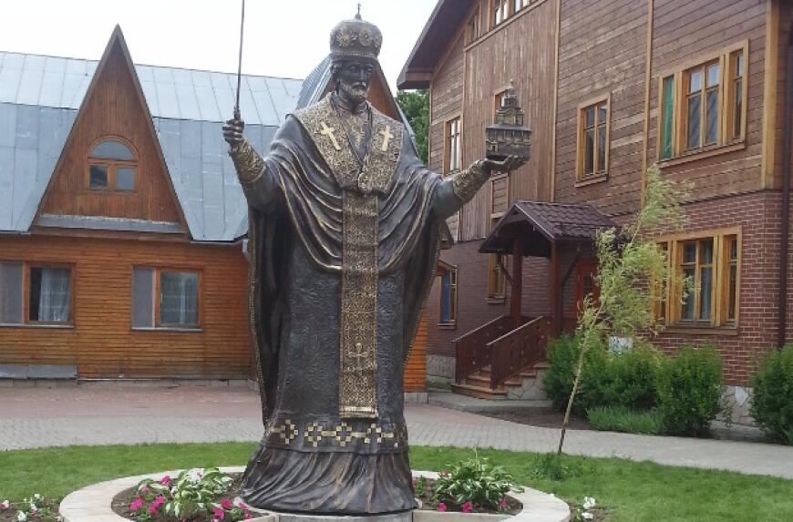 ...Хотя установка бронзового монумента святителю Николаю Чудотворцу состоялось не так давно – летом 2016 года, но представить нынче монастырь без «иконы в бронзе» (так назвал работы заслуженного художника России скульптора Сергея Михайловича Исакова Святейший Патриарх Кирилл) трудно. Кажется, что этот памятник особо близкому русской душе святому был тут изначально. Настолько органично разместился он рядом с детским корпусом, где живут 20 воспитанниц «Службы помощи семье и детям», а в считанных метрах находится деревянный Успенский храм, построенный в северных традициях современными мастерами из города Северодвинска! По рассказам настоятельницы обители игумении Неониллы (Фроловой), круг, в котором стоит святитель Николай с мечом в одной руке и храмом – в другой, был обустроен, оформлен лет 10 назад. Одно время в нем хотели сделать сень под крестом... Потом еще что-то собирались сделать... Экскурсии приходили, люди интересовались: «Что это такое? Для чего?» А когда в монастырь пришла фотография скульптурной работы батайского мастера (Сергей Михайлович живет и работает в городе Батайске Ростовской области), сестры объездили на машине всё село: смотрели, куда можно поставить скульптуру. И в какой-то момент поняли, что именно на территории монастыря, в круге, вызывающем вопросы, ее место. Что интересно: ряд памятников святителю Николаю работы Исакова стоит по периметру российских границ, включая Курильские острова, Анадырь, Калининград, Майкоп. А памятник на Земле Франца Иосифа является самым северным памятником в мире (в 600 километрах от Северного полюса). И еще одно примечание: первым монастырем, где была установлена и освящена скульптура святителя Николая, созданная Исаковым, стал Ачаирский Крестовый женский монастырь Омской епархии. Теперь и в Никольском Шостьенском ставропигиальном женском монастыре на Рязанской земле стоит бронзовый монумент Небесному покровителю обители.