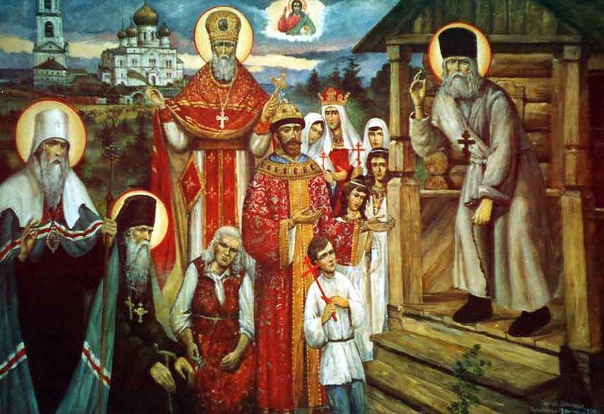 С точки зрения истории каждое событие должно быть на своем месте, не могут в исторической, сугубо реалистической картине вдруг совместиться события или герои разных веков. Однако, если смотреть на историю все с той же точки – Вечности… Вот работа «Царская семья перед Серафимом Саровским». Преподобный Серафим благословляет будущих (здесь они еще без нимбов) страстотерпцев. С позиции исторической такое просто невозможно. Но здесь тоже работают время и пространственные правила иконы, а потому – нет ничего удивительного, что святой благословляет семью царя, – по инициативе и усилиями Государя он был прославлен. Благословляет на то, чтобы выдержать, вынести предстоящие испытания, которые приведут их к святости…