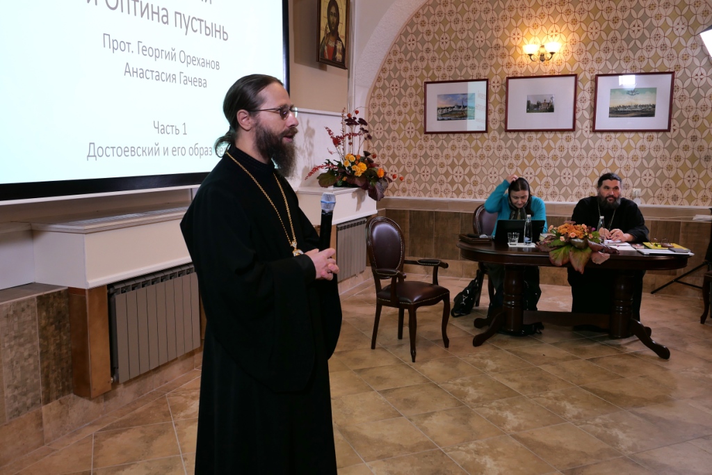 Второй раздел лекции, представленный протоиереем Георгием Орехановым, был посвящен собственно теме «Достоевский и Оптина пустынь». Продолжая мысль А.Г. Гачевой о мире, современном Достоевскому, мире, «в котором Христос не воскрес», отец Георгий привел еще несколько очень ярких свидетельств «разительного и глубокого атеизма», по словам В.В. Розанова, пережитого Россией в 1880-х годах, когда «казалось невозможным верить» и традиционные христианство и церковность полностью игнорировались. Например, обращение к Церкви Константина Леонтьева, будущего монаха Климента, а в то время дипломата и успешного литератора, вызвало в обществе серьезные сомнения в его психической полноценности. Да и сама по себе поездка в Оптину, о которой уже повсеместно шла слава, тем не менее в кругу Достоевского и Толстого тоже считалась чем-то из ряда вон выходящим.