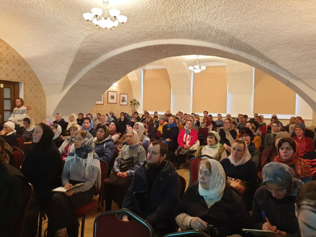 На этот раз перед многочисленной аудиторией, которую составили насельники обители, паломники, специально приехавшая из Москвы православная молодежь, выступили два лектора: профессор Православного Свято-Тихоновского университета доктор исторических наук протоиерей Георгий Ореханов и ведущий научный сотрудник Института мировой литературы Российской академии наук, член Комиссии по изучению наследия Ф.М. Достоевского при Президиуме РАН доктор филологических наук А.Г. Гачева.
