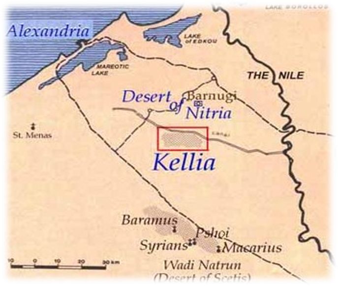 Места, которые связаны с Нитрийской пустынью, с Келлиями и Скитом, располагаются вблизи от дельты Нила, недалеко от Александрии. В 40 километрах от Александрии находится Нитрия, примерно в 18 км – Келлии, и на расстоянии ночного перехода (днем, как правило, не путешествовали: в пустыне легко заблудиться, поэтому путешествовали ночью по звездам, к тому же днем было жарко) находились и хижины тех, кого называли скитянами. Они жили в месте под названием Скит.