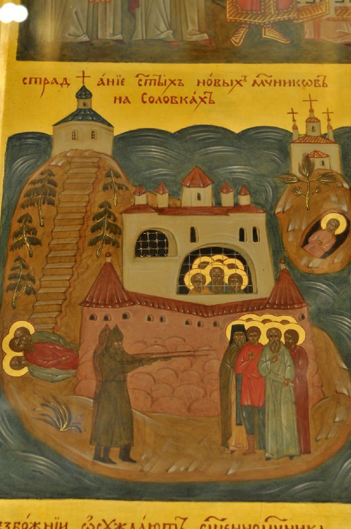 По благословению митрополита Ювеналия к Юбилейному Архиерейскому Собору группа иконописцев мастерской Православного Свято-Тихоновского богословского института написала икону Собора Новомучеников и исповедников Российских. Рассказ о ее композиции, а также о непростом процессе поисков, когда нужно было изобразить не только явленных подвижников, но и неявленных, известных лишь Богу, – тема объемная, многогранная, заслуживающая отдельного разговора. Сейчас же обратим внимание на первое клеймо (их на иконе пятнадцать). На нем изображено одно из наиболее известных мест мученических подвигов XX века – Соловки. Тот самый Соловецкий лагерь особого назначения, что вошел в новейший словарь аббревиатур русского языка как СЛОН. Тот лагерь, где за безумство революционных «свершений» заплачено тысячами и тысячами человеческих жизней. Здесь, на острове Анзер, в больничном изоляторе, размещенном в храме уединенного Распято-Голгофского скита, в 1929 году во время эпидемии тифа скончался узник, чьи проповеди собирали множество народа, а проявления народной любви он чувствовал везде – и на воле, и в заключении. На Соловках, после того, как с островов был увезен архиепископ Иларион (Троицкий), он был избран новым главой Соловецкого православного духовенства. Это архиепископ Воронежский Петр (Зверев).