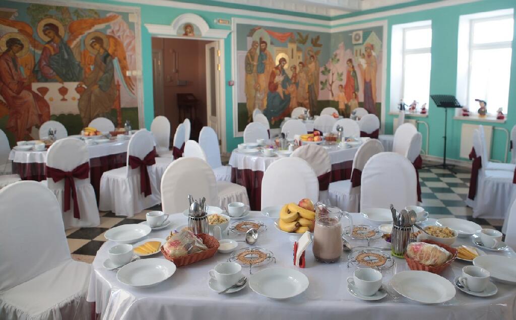 Спрашиваю о том, как дети попадают в приют, прошу рассказать о судьбах девочек. Но пришло время обеда, и матушка приглашает в трапезную, предлагает сначала подкрепиться и посмотреть концерт, а уж потом обо всем поговорить. Мы просим показать помещение, где едят дети. Интерьер и сервировка зала больше напоминают атмосферу института благородных девиц. На столе белые скатерти, хорошая посуда, столовые приборы…