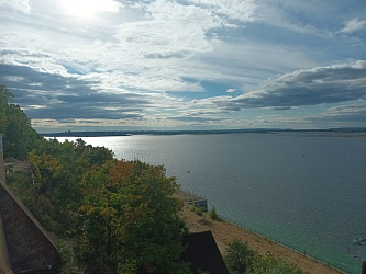 Говорим о строительстве: игумен Амвросий показывает новую ограду, балкончик, смотровую площадку, вид с которой на Свияжск и просторы завораживает.