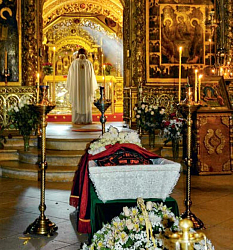 В последнюю ночь отец Михаил почти не спал. «Радуйся, Невесто Неневестная», — очень часто повторял он припев из акафиста как бы в забытьи, в полусне. В 9:00 обычно начинали келейное правило, но в этот день батюшку не стали будить, потому что он только заснул. Проснувшись около 11:00 и узнав, который час, старец немного осерчал: нужно было все равно будить и молитву начинать в свое время — правило должно исполняться вовремя, и телесные немощи не причина его откладывать. Причастившись Святых Христовых Таин, старец как будто мирно уснул и при завершении канона на исход души отошел ко Господу. Как раз начиналось вечернее богослужение. Пока шла служба, отца Михаила облачили в погребальные схимнические одежды. После службы братия из храма пришли в келью, послужили литию и соборно с пением перенесли тело старца в Духовской храм. Чувствовалось не только торжество, но и строгий порядок. Все вписывалось в монастырский уклад.