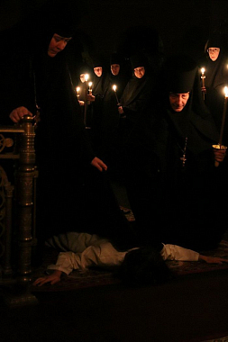 «Как оказалось, самое страшное в Новодевичьем монастыре – это ходить со свечой. Во время богослужения зажженная свеча на высоком подсвечнике, стоящем на полу, символизирует собой пророка Иоанна Предтечу, поэтому сестра-церковница должна идти со свечой перед символизирующем Спасителя Евангелием, которое выносят из алтаря священнослужители. Свеча с подсвечником не очень тяжелая, но поднимать ее не всегда удобно из-за окаймляющих подсвечник украшений из живых цветов.