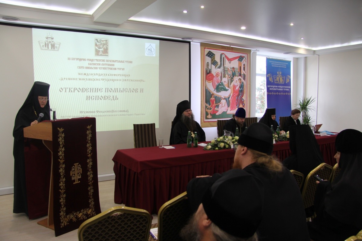 Серьезное внимание на конференции было уделено практике откровения помыслов. В докладе «Откровение помыслов и исповедь» настоятельница Свято-Алексиевского женского монастыря г. Саратова игумения Феодосия (Бессонова) основной акцент сделала на отличие откровения помыслов от исповедания грехов перед духовником. Исповедь – это церковное Таинство. Исповедание греховных помыслов и грехов перед старцем (или старицей), каковым может быть лицо, не имеющее священного сана, – установление нравственного свойства. Но и оно совершается по воле Божией, чему можно найти подтверждение в Божественных указаниях. Здесь тоже присутствует и действует Святой Дух. По словам святителя Феофана (Затворника), старцу принадлежит разрешение грехов простительных, и разрешаются они откровением. Широко известны слова Вышенского подвижника: «Как открыт такой грех, так и прощен». Об огромной нравственной пользе монастырского откровения помыслов говорила игумения, обращаясь к духовному опыту монашества, накопленному с древних веков. На протяжении всей человеческой истории ищущая спасения душа встречается со множеством врагов: это и мир с его прелестями, и плоть, и страсти, и навыки греховные, и нападки бесовские. Брань с ними идет не только каждый день и час, но и каждую минуту. Поэтому откровение помыслов перед старцем или старицей происходит чаще (бывает, что несколько раз за день), чем исповедь. Духовно опытные наставники предупреждают учеников от будущих грехопадений, искореняя грех в самом зародыше, чтобы этот сорняк не дал всходы, не пустил корни в сердце человека.