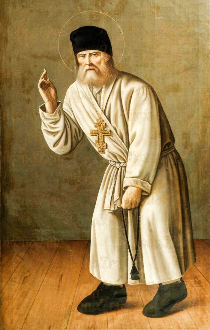 При входе в келию находится большой, во весь рост, портрет преподобного в белом балахончике, с шапочкой на голове и благословляющего правой рукой. Работа изумительная.
