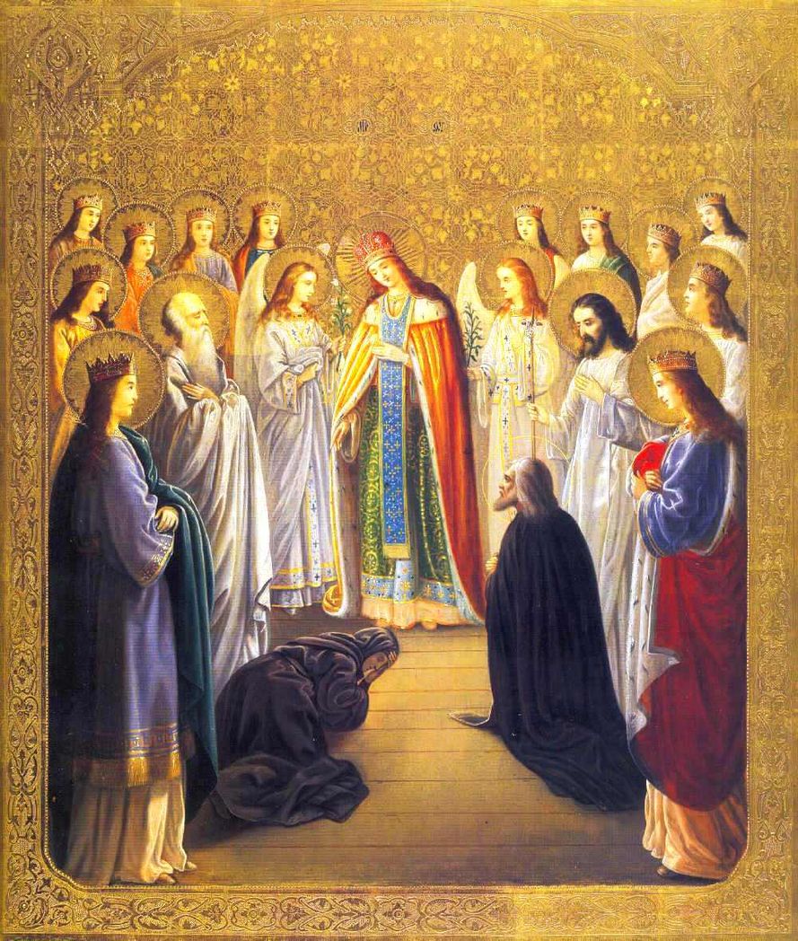 С нашим приближением храм все рос, и вскоре перед нами предстало грандиозное сооружение, которое своими размерами и красотой архитектуры казалось необычным в нашем крае, пока единственное в своем роде. Поднявшись по ступеням высокой паперти, мы вошли в него. Прекрасный, полный света, украшенный удивительной дивеевской живописью, собор поражал своей одухотворенной красотой. Мы уже не замечали его обширности: настолько гармонировали между собою размеры, которые скрадывались еще тянувшимися вдоль стен широкими хорами. На последние входят со светлой, отделенной от храма паперти по двум расходящимся лестницам, украшенным легкою металлическою решеткой. Паркетный пол хоров и небольшие изящные алтари на той и другой стороне еще более смягчают общую внушительность собора. Но и присмотревшись ко всей обстановке его, вскоре же почувствуешь, что в устройстве этого храма участвовал мягкий художественный вкус просвещенной женщины, которая создавала место молитвы для себе подобных.