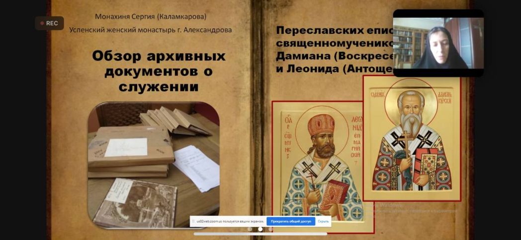 Рассказ о священномучениках Дамиане (Воскресенском) и Леониде (Антощенко) существенно дополнил доклад монахини Сергии (Каламкаровой), благочинной Свято-Успенского женского монастыря Александровской епархии. Матушка Сергия в своем выступлении «Служение священномученика Дамиана (Воскресенского) и Леонида (Антощенко) по новым документам» представила обширный обзор источников, отражающих служение будущих священномучеников на Переславской и Александровской земле.