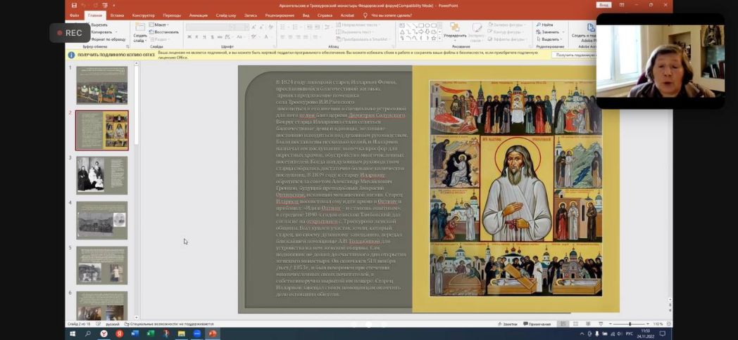 Доклад «Семейный подвиг супругов-новомучеников Тихона и Хионии Архангельских в судьбе Троекуровского монастыря в эпоху гонений» Е.И. Каликинской, кандидата биологических наук, руководителя музейно-просветительского комплекса Феодоровского женского монастыря г. Переславля-Залесского раскрыл историю семьи, жизнь которой была тесно связана с Троекуровским Свято-Димитриевским Иларионовским женским монастырем Липецкой митрополии. В судьбе супругов-новомучеников Тихона и Хионии Архангельских, как в капле воды – мир, отразилась история всей России ХХ века – отметила Екатерина Игоревна в начале своего выступления.