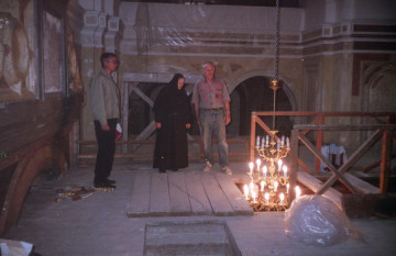 «Осенью 2001 года отец Сергий Романов, настоятель храма Святого равноапостольного князя Владимира в Старых Садех, что через дорогу от Иоанно-Предтеченского монастыря, попросил меня служить еженедельно молебны в монастырском соборе. Туда, в огромный собор, возвышавшийся над теснившими его строениями, можно было войти только через небольшую дверь, проделанную в восточной стене. Эта дверь вела в разрушенный алтарь небольшого придела в честь Святителя Николая Чудотворца. В основной части собора возвышался высокий деревянный помост. Областной архив уже съехал, но деревянные лестницы и перекрытия оставались неразобранными. И почему-то отопительная система оказалась демонтированной. Зимой на улице стояла суровая стужа и внутри храма – минусовая температура. Все же, несмотря на мороз, мы каждую неделю совершали там молебен с чтением акафиста великому Пророку и Предтече Иоанну. Благодарю Господа, что дал силы служить молебны с октября до начала лета без пропусков.