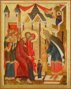 Вот как описал Введение во храм Пресвятой Девы Марии святитель Григорий Палама: «Когда же наступило время избрания, то из дома и отечества Давидова были избраны Богом Иоаким и Анна, которые, хотя были бездетны, но по своей добродетельной жизни и добрым нравам были лучше всех, происходивших из колена Давидова. И когда они в молитве просили у Бога разрешения безчадства и обещали Рожденное, с самого Его детства, посвятить Богу, им возвещается Богоматерь и даруется от Бога, как Чадо, чтобы от таких многодобродетельных была зачата Предобродетельная и Пречистая Дева, чтобы таким образом и целомудрие в соединении с молитвой оплодотворилось, и Пречистая соделалась Родительницею девства, по плоти нетленно родивши Того, Кто по Божеству прежде веков рожден от Бога Отца. И вот, когда праведные Иоаким и Анна узрели, что они были удостоены своего желания и Божие обетование им осуществилось на деле, тогда они, как истинные Боголюбцы, с своей стороны, поспешили исполнить свой обет, данный Богу: привели ныне в храм Божий Это, воистину, Святое и Божественное Дитя-Богоматерь Деву, лишь только Она перестала питаться млеком. А Она, невзирая на столь малый возраст, была полна Божественных дарований и более других понимала, что совершается над Ней, и всеми Своими качествами являла, что не вводят Ее в храм, но что Она Сама по собственному побуждению приходит на служение Богу, как бы на самородных крыльях стремясь к священной и Божественной любви, будучи убеждена, что Введение Ее в храм – во Святое святых – пребывание в нем есть желанная для Нее вещь. Поэтому-то и первосвященник, увидев, что на Отроковице паче всех пребывает Божественная благодать, пожелал вселить Ее во Святое святых и убедил всех охотно согласиться с этим. И Бог содействовал Деве и посылал Ей через Своего Ангела таинственную пищу, благодаря которой Она укреплялась по природе и соделалась чище ангелов, имея при этом в служении Небесных духов».