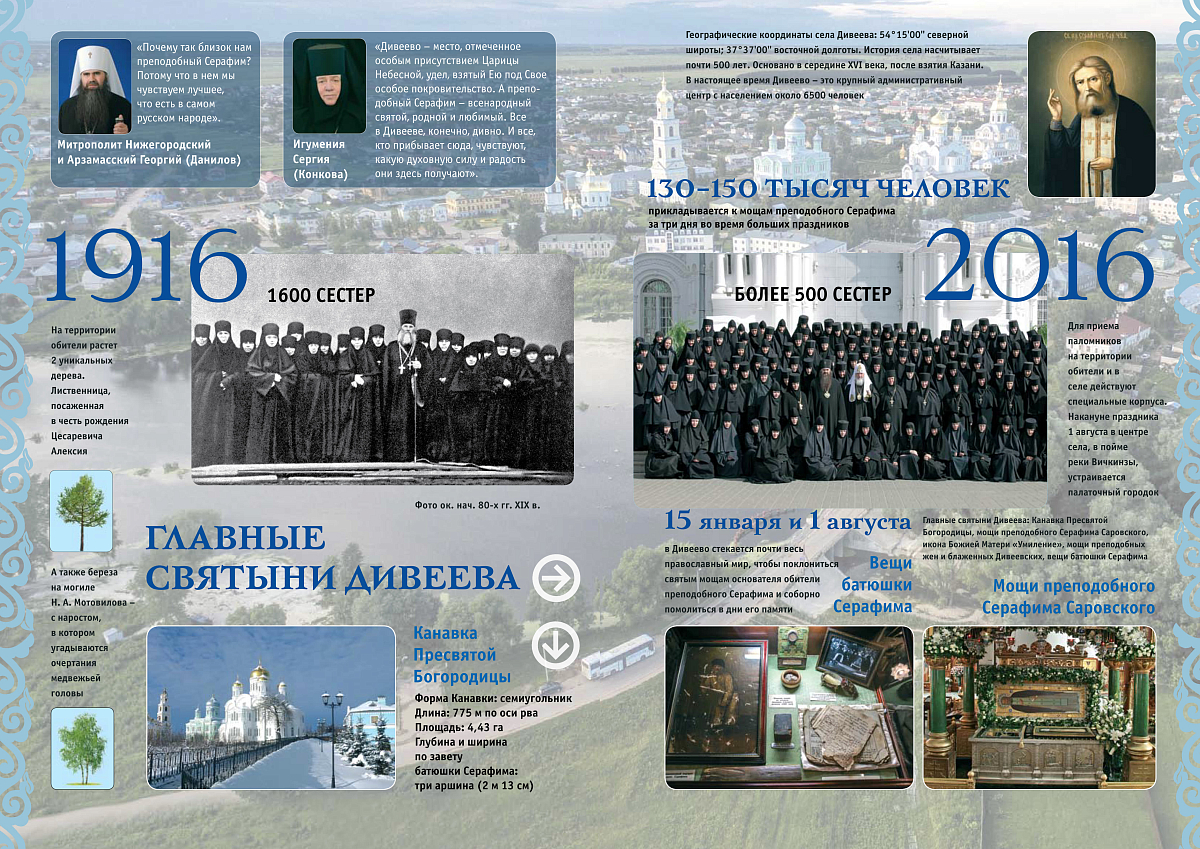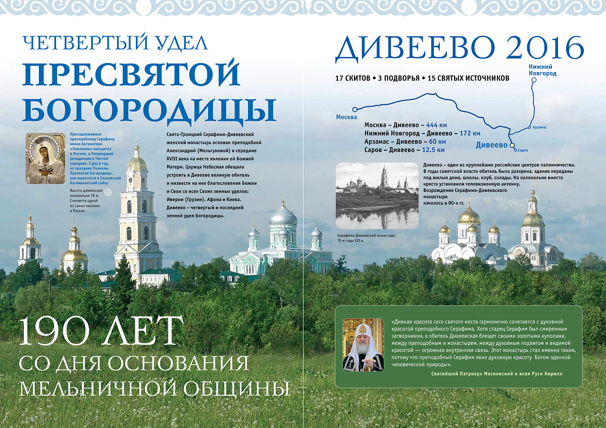 Для Дивеева 2016 год богат на юбилеи: монастырь отмечает 190 лет со дня основания Мельничной общины, 25-летие возрождения обители и второго обретения мощей преподобного Серафима Саровского. Также в нынешнем году исполняется 25 лет игуменства настоятельницы Дивеева матушки Сергии (Конковой)