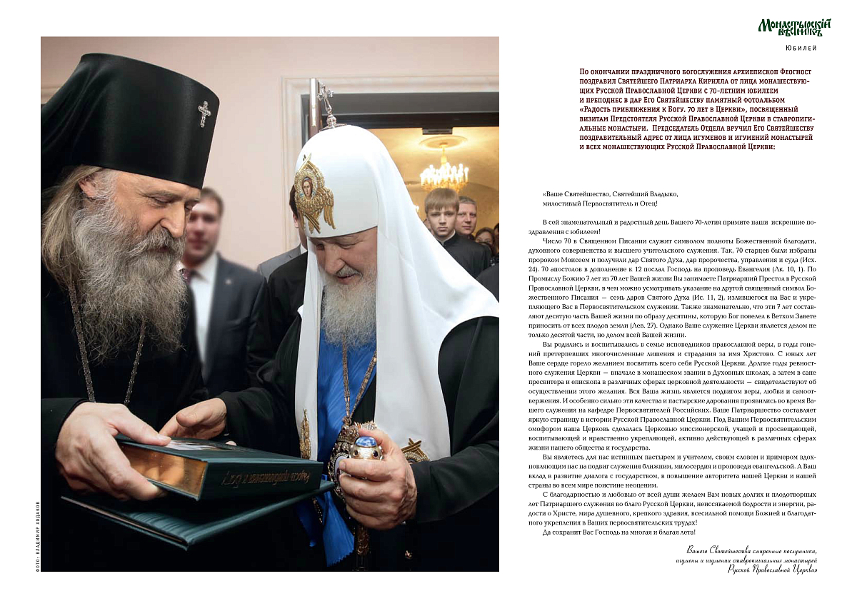 По окончании праздничного богослужения архиепископ Феогност поздравил Святейшего Патриарха Кирилла от лица монашествующих Русской Православной Церкви с 70-летним юбилеем и преподнес в дар Его Святейшеству памятный фотоальбом «Радость приближения к Богу. 70 лет в Церкви», посвященный визитам Предстоятеля Русской Православной Церкви в ставропигиальные монастыри. Председатель Отдела вручил Его Святейшеству поздравительный адрес от лица игуменов и игумений монастырей и всех монашествующих Русской Православной Церкви:
