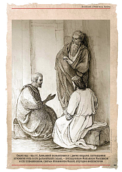 «В середине X века афонское монашество много страдало от сарацин, которые, после того как утвердились на острове Крит (827–896 гг.), постоянно беспокоили соседние греческие земли, в том числе и Святую Гору. Они теснили монахов, грабили и разоряли их жилища и монастыри. Многие из подвижников вынуждались оставлять Афон и в бегстве находили спасение от преждевременной гибели. Святая Гора осталась лишь с немногими обитателями».