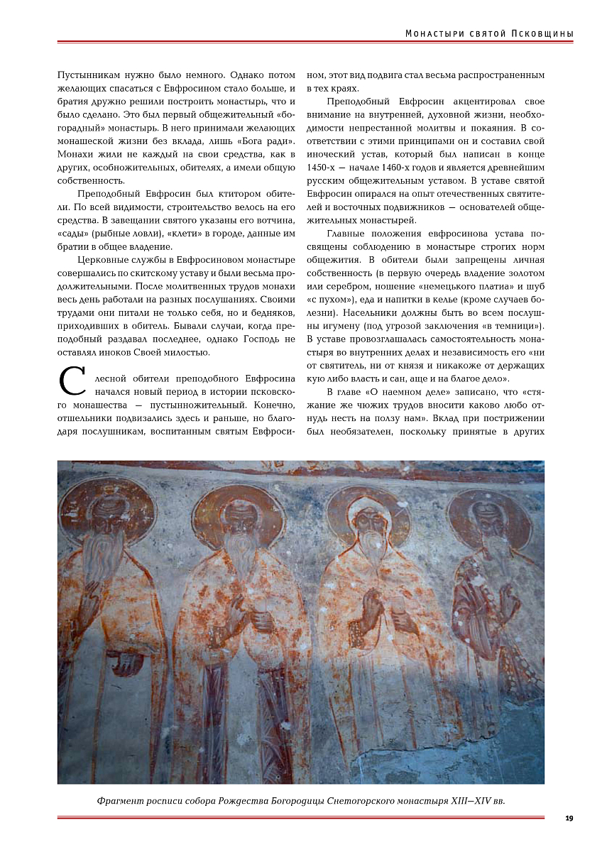 Мы чаще всего называем Евфросином, по-монашески, это имя преподобный получил в постриге. В миру, а затем в схиме его звали Елеазаром. Преподобные Евфросин и Никандр Псковский происходили из одной местности – деревни Виделебье близ Пскова, оба желали постнического жития. Приняв постриг в Рождества Пресвятой Богородицы Снетогорском монастыре, Евфросин стал ревностно подвизаться, угождая Богу. Чтобы избежать славы человеческой, около 1425 года он испросил у духовника благословения поселиться в уединении на реке Толве близ Пскова. Впоследствии здесь и образовался наш монастырь, а место стало называться Елеазаровой пустынью. В то время на Руси еще не существовало как таковых уставов монастырей, а были уставные грамоты епископов и митрополитов, духовные грамоты, завещания, поучения игуменов-основателей. Общее житие (когда монахи ничего не имели в своей собственности, все было общим) в монастырях очень трудно приживалось, часто в общежительные монастыри проникали черты особножительства. Преподобный же Евфросин был сторонником именно общего жития («не держите ничесоже особины в общине») и для своей братии написал общежительный устав. Для XV века, когда жил святой, этот устав был настолько строг, что многие называли старца «железный с железными». Он был очень скромным и смиренным и даже не принял священнического сана, в конце жизни постригся в схиму с именем Елеазар и преставился обычным схимонахом в 95 лет. Таким образом, имя, данное при рождении, вернулось ему в схимническом постриге. Поэтому и называется наш монастырь Спасо-Елеазаровским. Изначально монастырь был мужским и являлся центром молитвенной жизни Псковской земли. Сам преподобный был образованным человеком, и братию в обитель принимали в основном ученую. Монахи занимались переписью книг и рукописей, были аскетами и богословами. Для выяснения вопросов, связанных с отправлением богослужения, преподобный Евфросин пешком ходил в Константинополь и там был принят самим Константинопольским патриархом.