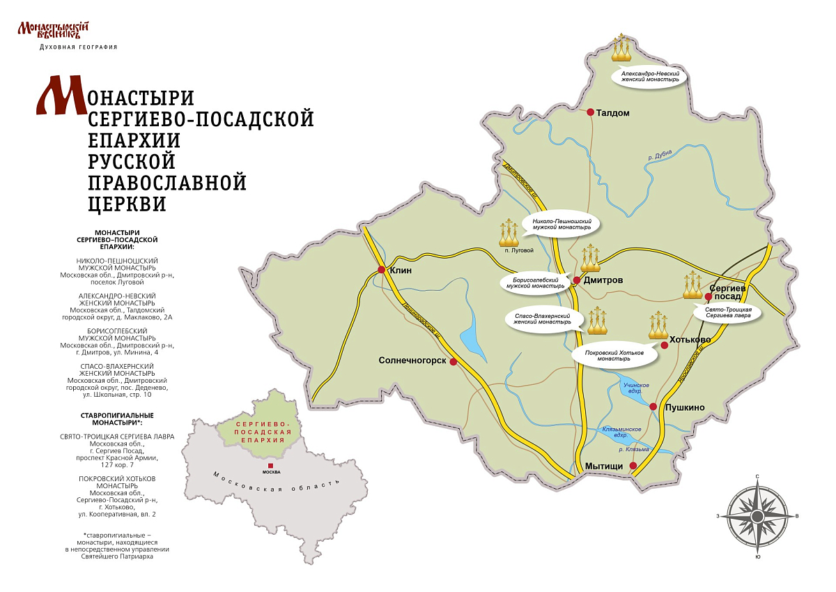 Краткий путеводитель по монастырям и монастырским подворьям Сергиева Посада, Хотькова, Дмитрова с информацией для паломников: адрес, телефон, сайт, соцсети, как доехать, список святынь, реквизиты для пожертвований